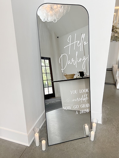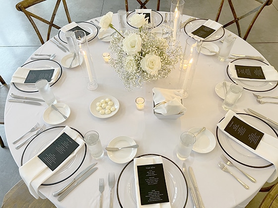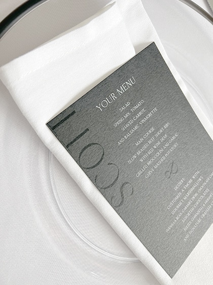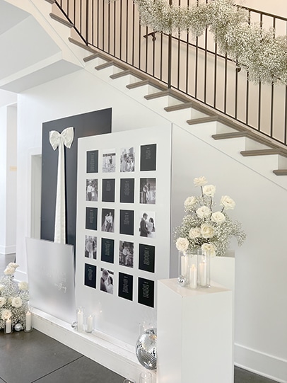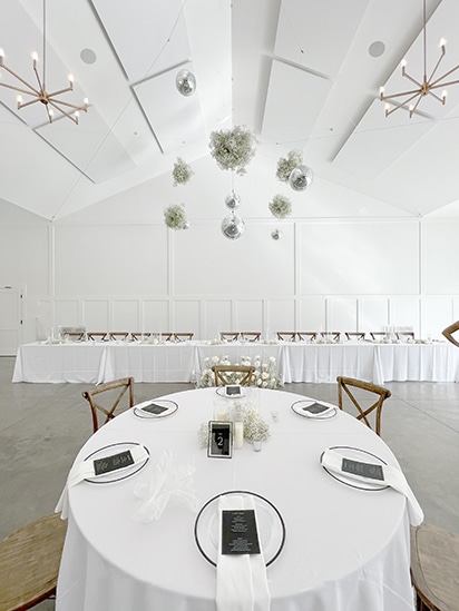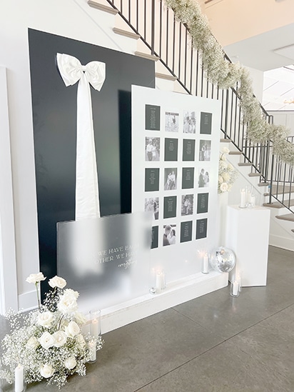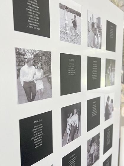 Afterwards, the cocktail hour happened indoors as people mingled throughout the space. As people entered the Lakeside Room (the reception space), they were awed by the babies breath and disco balls hanging from the ceiling! It was so beautiful! Each guest had a custom menu printed by Hitch Studio. We love designing custom stationery! Hannah and Austin’s invitations were printed with black and white ink on black paper. A very tone-on-tone, classy look. So we designed the menus with each guests’ name on top in black ink and their meal choice on their menu! Everyone knew exactly where to sit because of the amazing seating chart that Hitch Studio set up and designed as well!